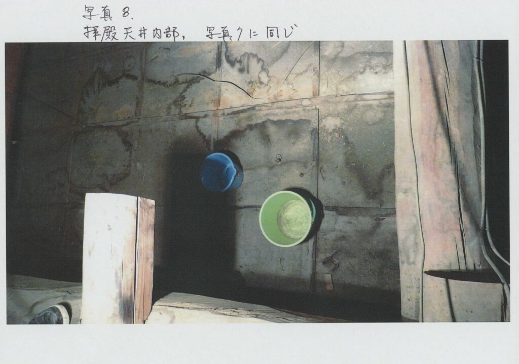拝殿内には無数のバケツが配置されています。これは雨漏りした水をためておく為です。なにも無いと写真の漏水後のように拝殿の天井裏に直接水たまりが出来てしまいます。