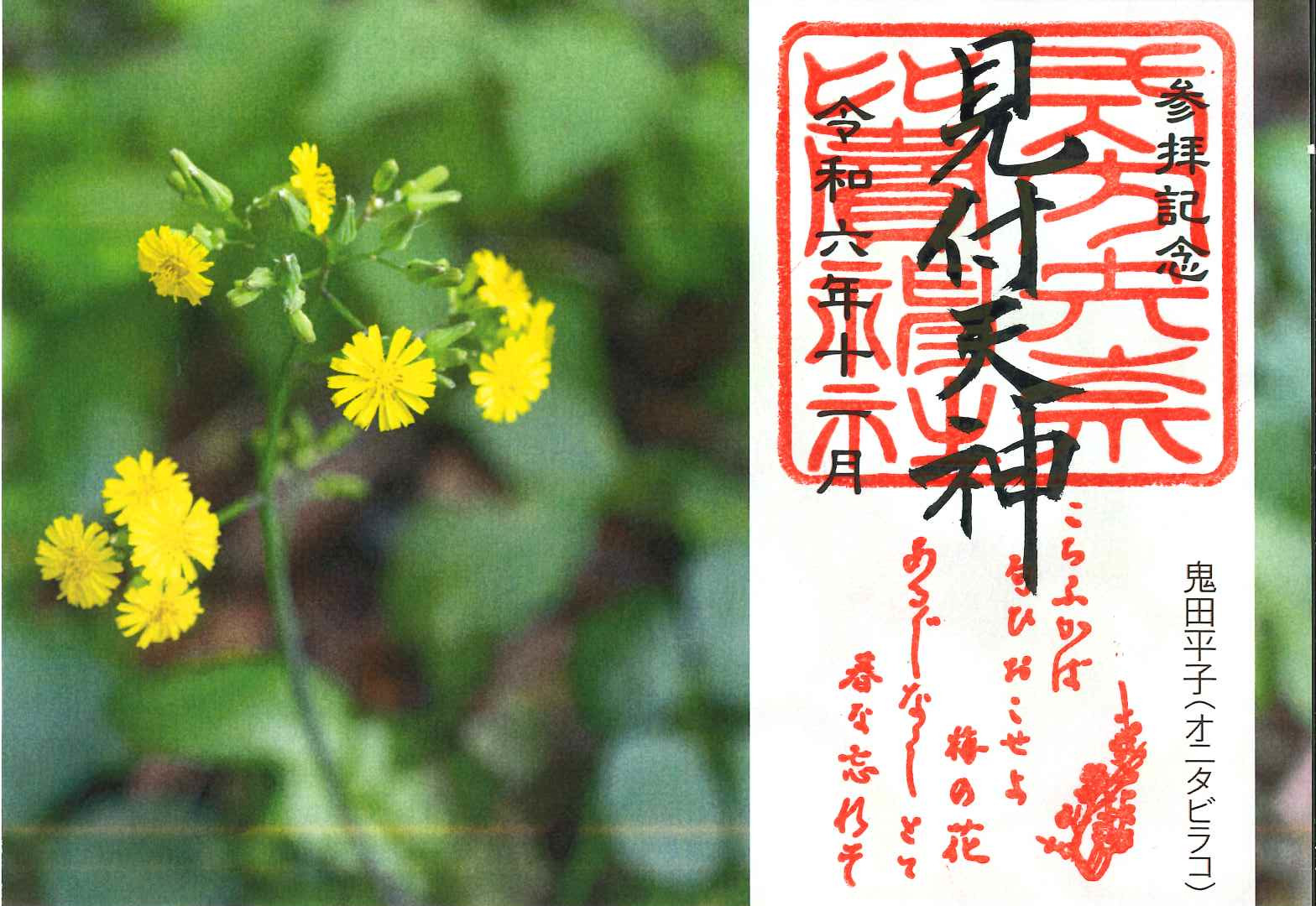 参拝記念 限定御朱印(令和6年11月1日より) 限定御朱印 2024.10.31 令和6年10月1日より31日までの参拝記念限定御朱印となります。 今回のテーマは「鬼田平子(オニタビラコ)」です。 こちらの御朱印は、紙でのお渡しのみとなります。数量限定となりますので、お早めにどうぞ。