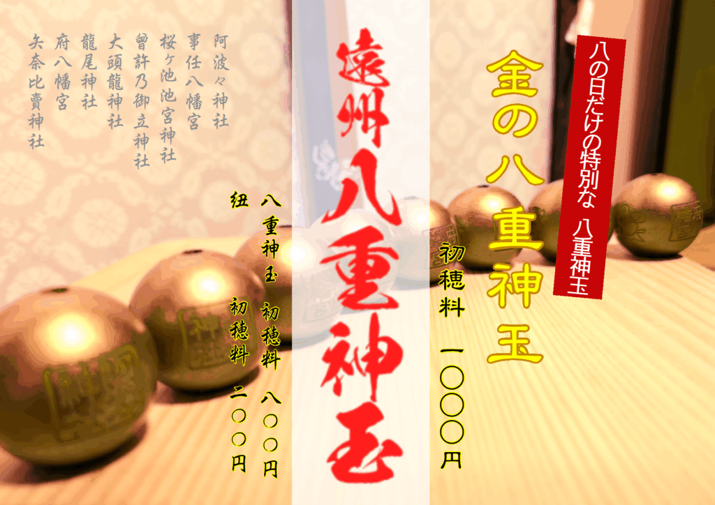 この金の八重神玉は、毎月8日、18日、28日と「八」の付く日だけに頒布する「特別な玉」となります。