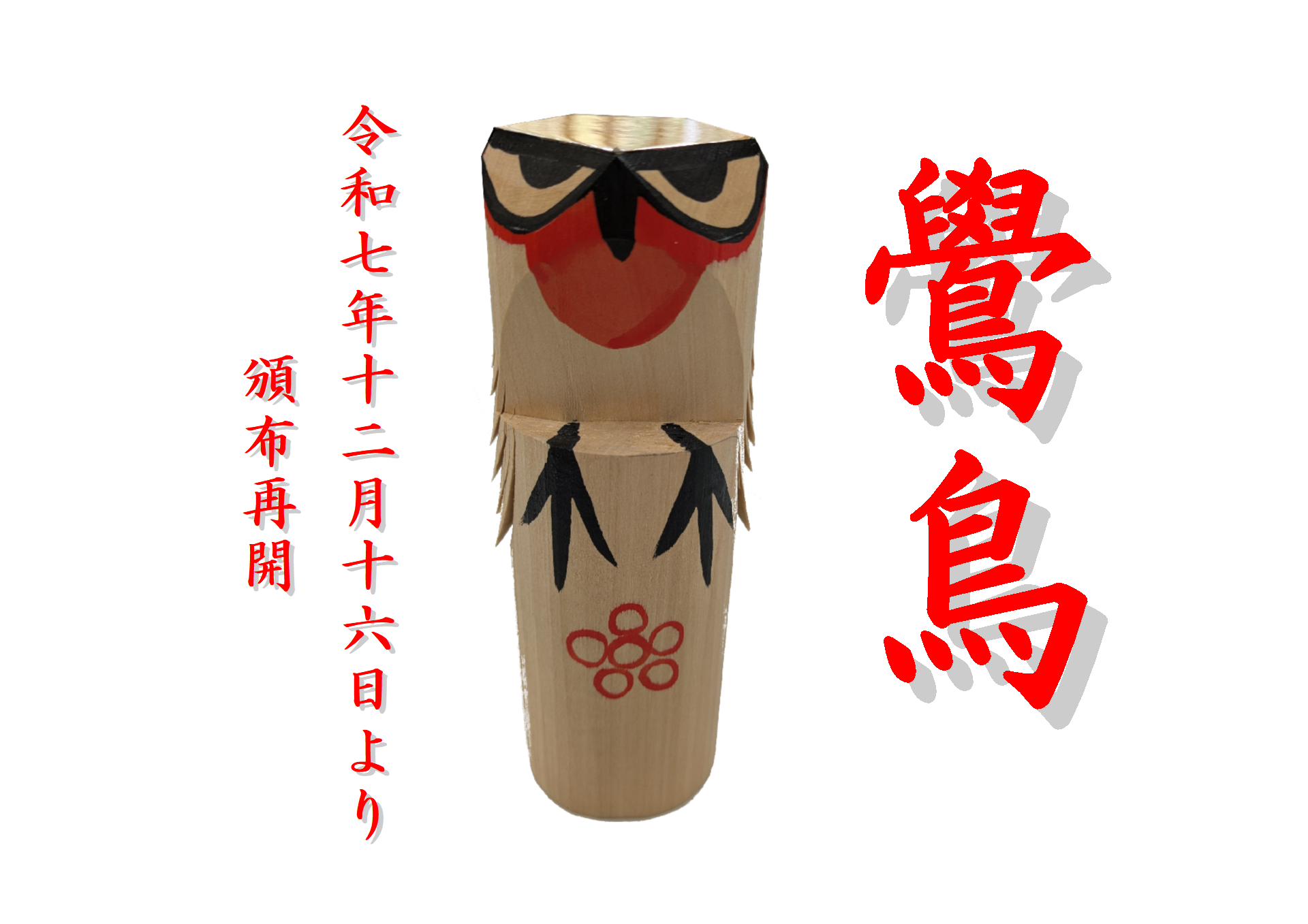 鷽鳥(うそどり)頒布再開のお知らせ(令和7年12月16日より) 授与品 2025.12.02 令和7年12月16日(火)より、鷽鳥(うそどり)の頒布を再開します。 鷽(うそ)は御祭神である菅原道真公とたいへん御縁のある鳥です。