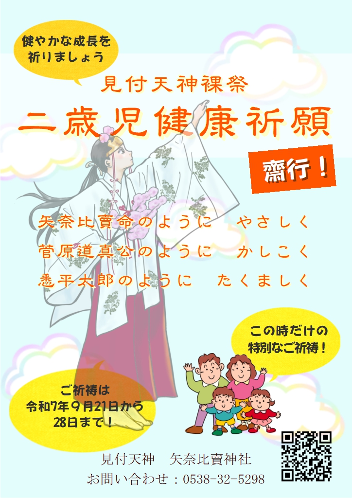 二歳児健康祈願は、国指定重要無形民俗文化財である「見付天神裸祭」期間中の 令和7年9月21日(日)~28日(日)のみ行います。