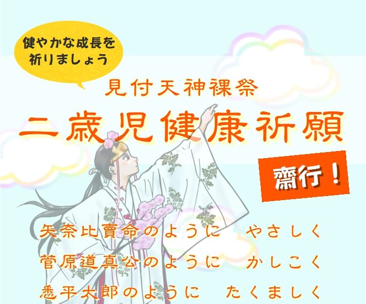 見付天神では、二歳を迎えられるお子様(数え2歳)、また迎えられたお子様(満2歳)の”健やかな成長”と”災難除け”を祈るご祈願を行っています。
