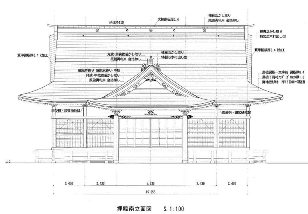 拝殿周囲に足場を設置するため、祈祷待合所と拝殿をつなぐ渡り廊下が撤去されました。