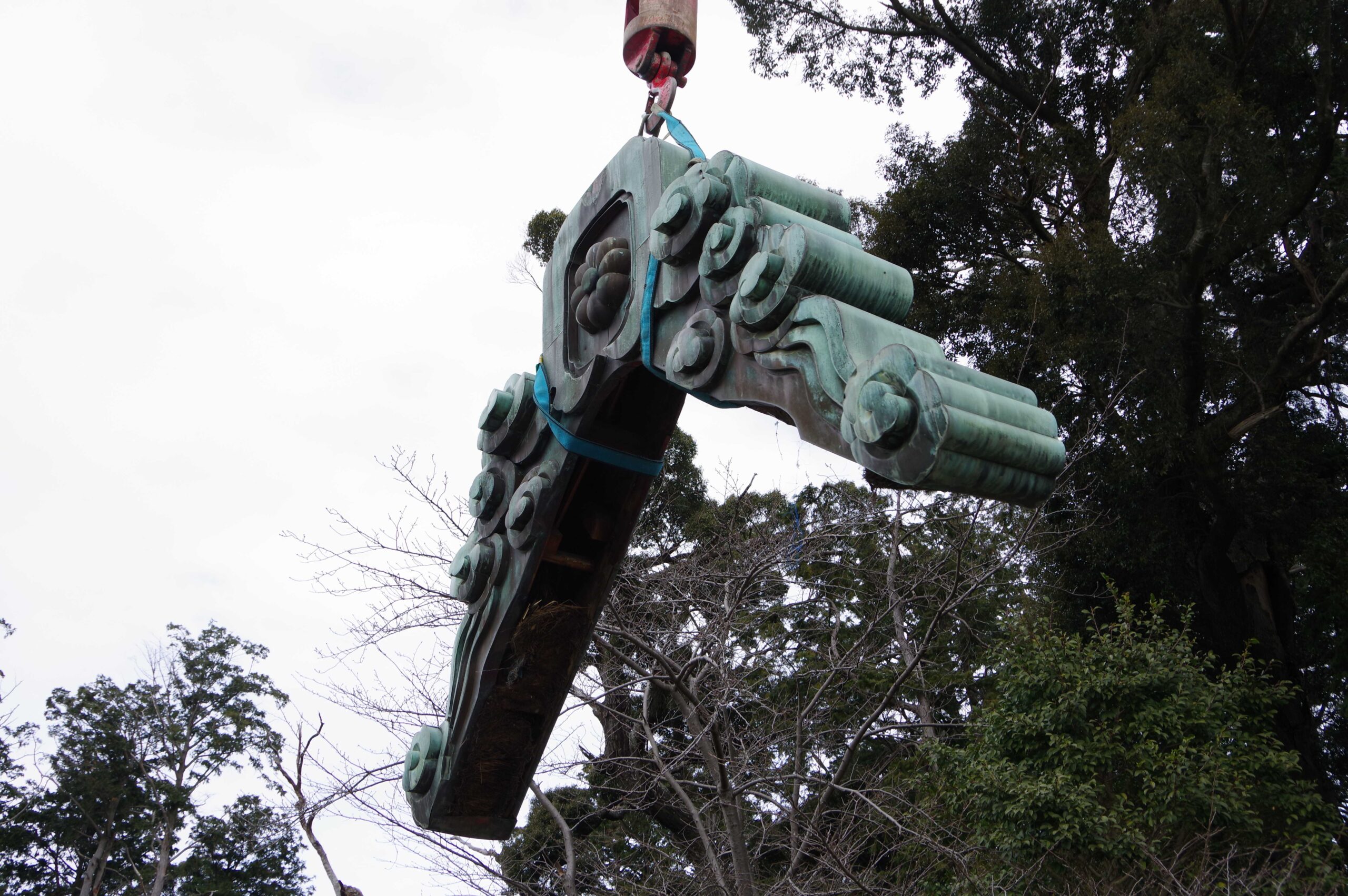 この「鬼紋」や「棟鬼」は、修復を行うのに、より高度な技術が要求されます。それにともなって、多くの時間も要します。よって、神社境内ではなく、外部作業所にて修復されるため、いち早く取り外し運ばれていきました。