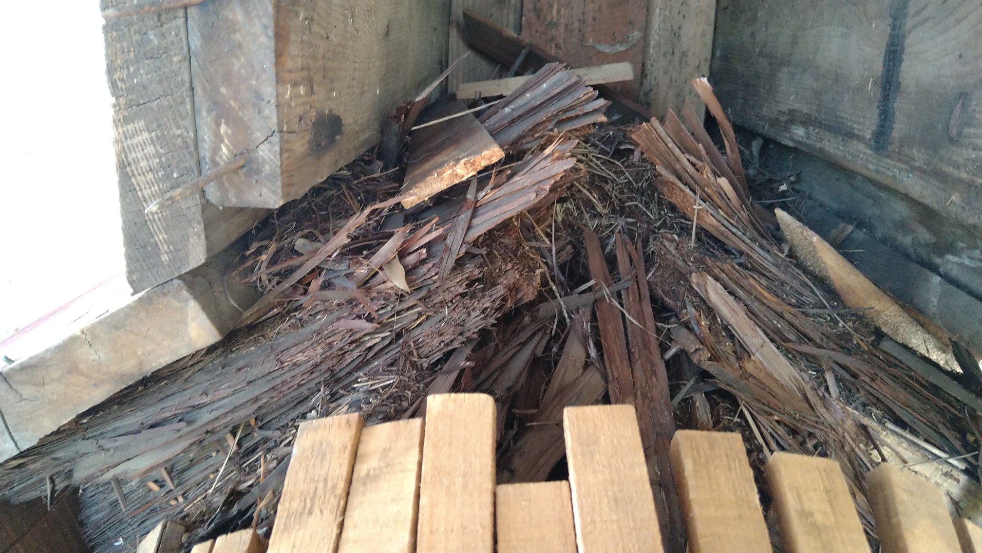 しかし、よく見ると下地の下には檜皮葺き(ひわだぶき)の屋根が現存していました。前回の屋根修復時に、檜皮屋根の上に銅板屋根を乗せて補修したようです。