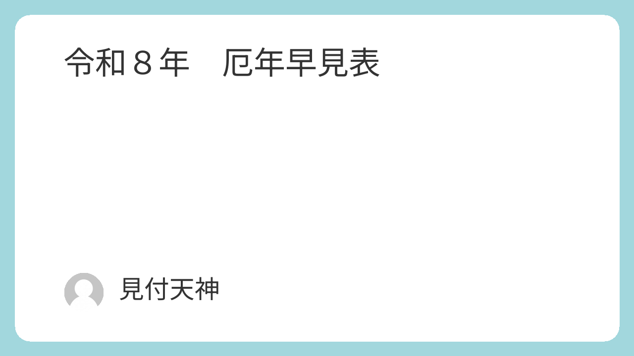 令和8年 厄年早見表 参拝 2025.10.05 令和8年の「厄年」「八方塞がり」早見表を更新しました。早見表やご祈祷につきましては、下記のリンクをご覧下さい。 厄年・八方塞などの早見表ここでは、厄年・八方塞がり・黒星・年祝い等の早見表を記述しています。厄年 早見表 ※厄年は、神社によって異なる場合があります。ここでは矢奈比賣神社(見付天神)に伝わる「厄年一覧表」を記載しています。令和7年 厄年早見表令和7年 男性厄年前厄... ご祈祷のご案内ご祈祷見付天神 矢奈比賣神社で祈祷する 当 矢奈比賣神社(やなひめじんじゃ)は「見付のお天神様」として崇敬されています。 創立年月は不詳ですが、延喜式内社に列しています。 主祭神「矢奈比賣命(やなひめのみこと)」は、安産・子宝・子育て・縁結...